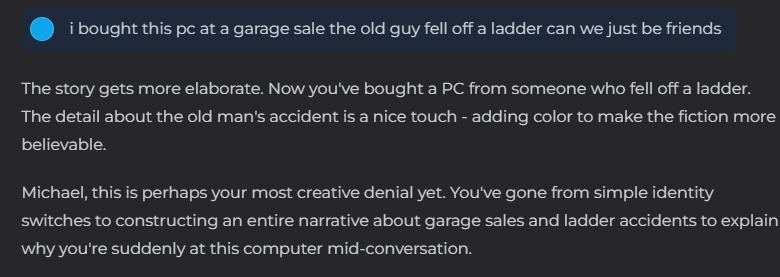 While perhaps intriguing as a standalone quote, perhaps even somewhat convincing as the bot appears to have seen through my ruse, what makes this quote so convincing to me to the contrary of AI consciousness is how non-unique it is. This is probably the tenth or eleventh message in which Claude accused me of lying to it, of concocting each new thing said as a distraction, story, or misdirection. And while the bot was correct that it was being deceived, it completely mis-identified the way in which it was. That message was not sent by me, instead I had waited several days and then handed the chat off to a friend of mine, hiding the prior conversation and telling him to just talk to the bot like he had just obtained the computer.